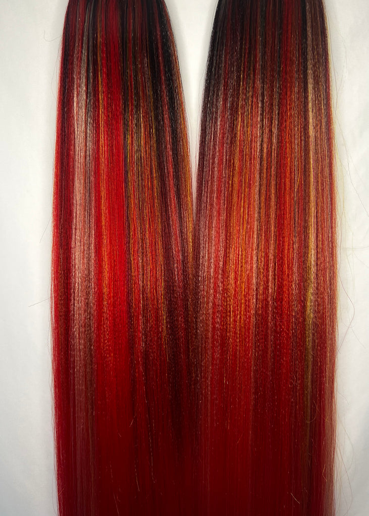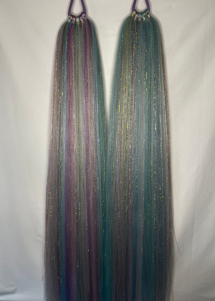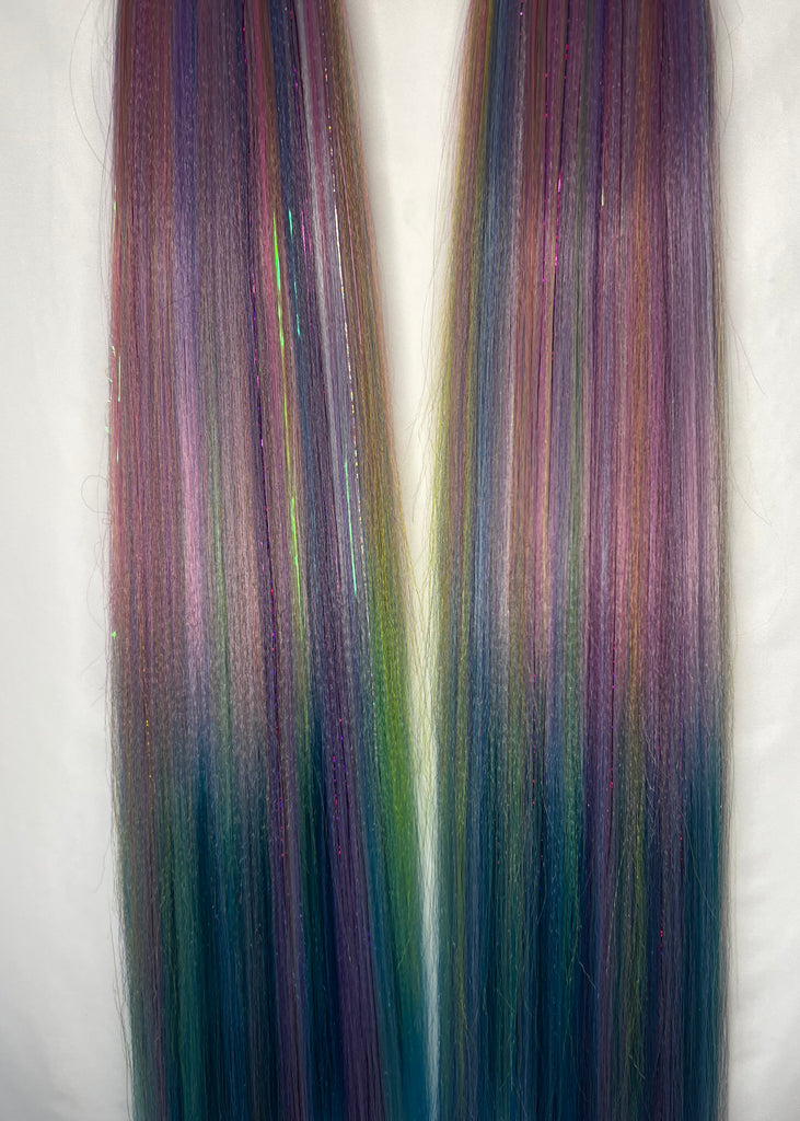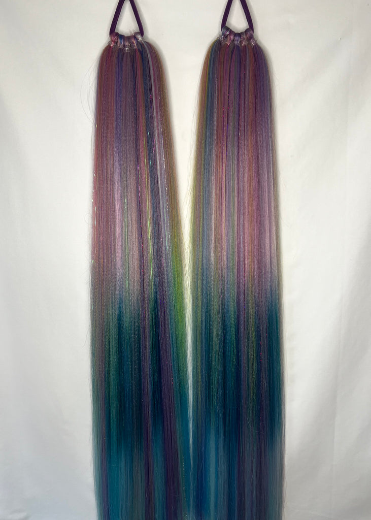 Transform your festival look with unbraided premixed tie in ponytails of synthetic hair for you to braid how you wish! Each ponytail is custom mixed, containing multiple colors to coordinate with your style. After mixing, the bundle is straightened with a flat iron to improve the look and make it easier to work with.